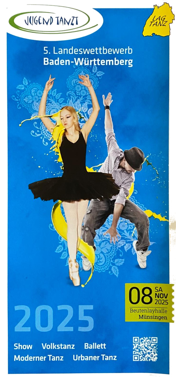 Nach einem erfolgreichen Wettbewerb 2023 mit 9 Preisträger-Gruppen, die zum Bundeswettbewerb nach Paderborn reisen konnten, freuen wir uns, wieder zum Landeswettbewerb Jugend tanzt einladen zu können. Er findet am Samstag 8. November in der Beutenlay-Halle in Münsingen statt. Er ist eine wunderbare Gelegenheit, sein Tanzkönnen zu präsentieren, die Darbietungen anderer Tanzgruppen zu sehen und sich mit ihnen auszutauschen. Der Landeswettbewerb dient gleichzeitig zur Auswahl der Gruppen, die Baden-Württemberg beim Bundeswettbewerb im Frühjahr 2026 in Paderborn vertreten dürfen. Eingeladen sind Tanzgruppen mit Kindern, Jugendlichen und jungen Erwachsenen im Alter von 7 bis 27 Jahren aus allen Bereichen der Tanzkultur (Vereine, Tanzstudios, Schulen, freie Gruppen, ...). Bewertet wird in verschiedenen Kategorien und Altersgruppen. Einzelheiten zur Meldung und Teilnahmekriterien sind weiter unten auf dieser Seite zu finden.
